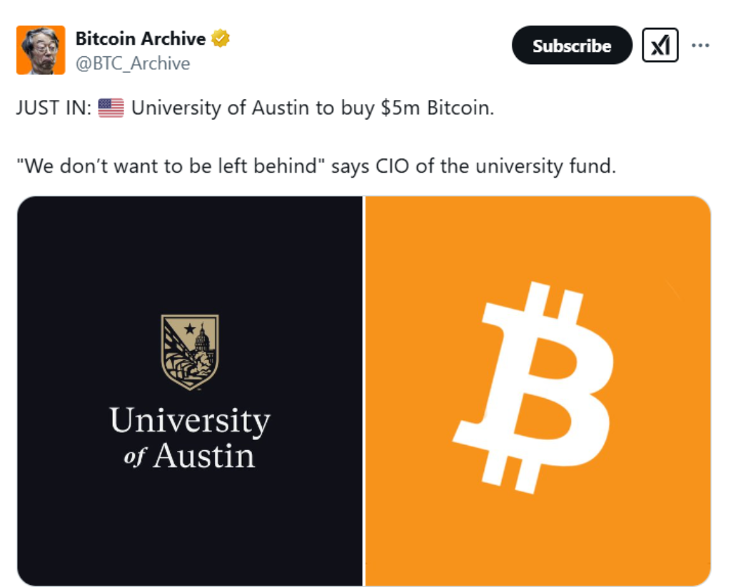 Theo báo cáo của Financial Times , trường Đại học Austin, ngôi trường 142 năm tuổi, đang huy động một quỹ Bitcoin trị giá 5 triệu đô la như một phần trong quỹ tài trợ 200 triệu đô la của mình, trở thành quỹ tài trợ đầu tiên của trường đại học Hoa Kỳ ra mắt quỹ Bitcoin chuyên dụng.