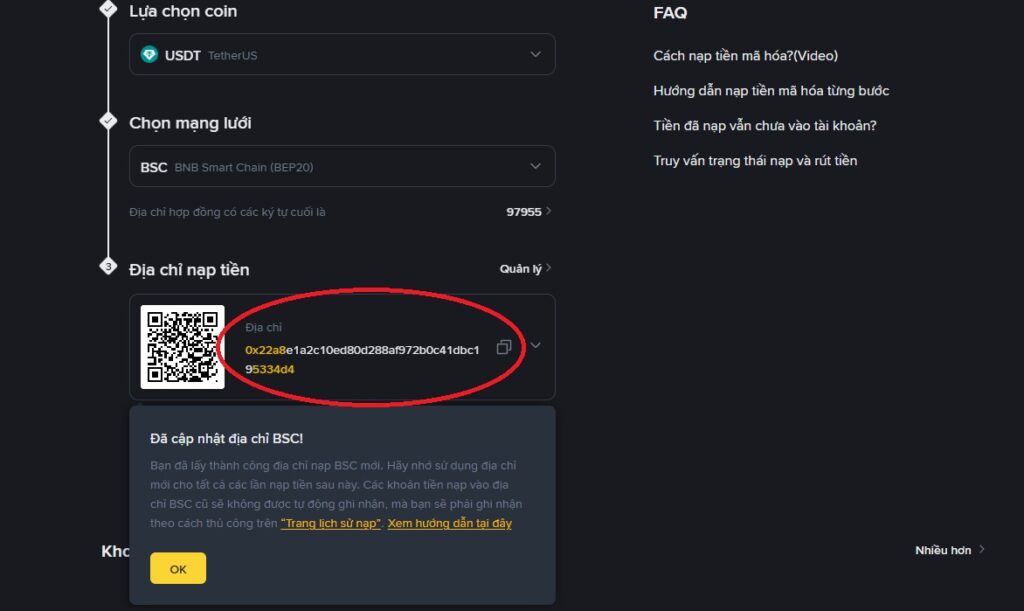 Bạn sẽ thấy địa chỉ nạp của sàn có dạng như:0xA82b1.....1923