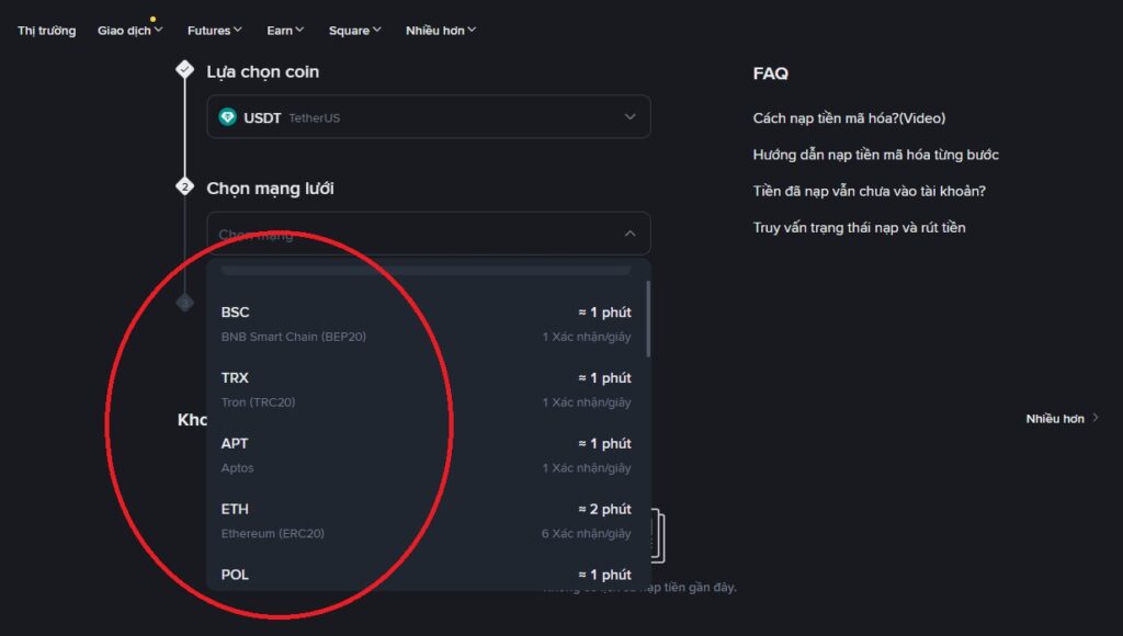 Ví dụ khi Deposit USDT sẽ có các mạng:
