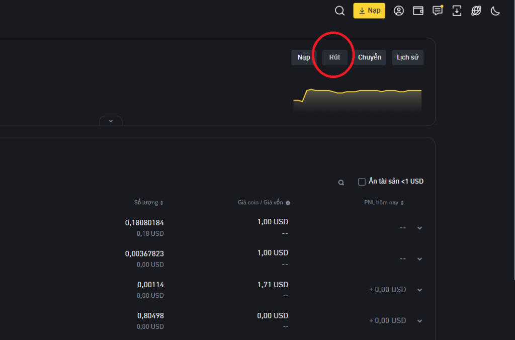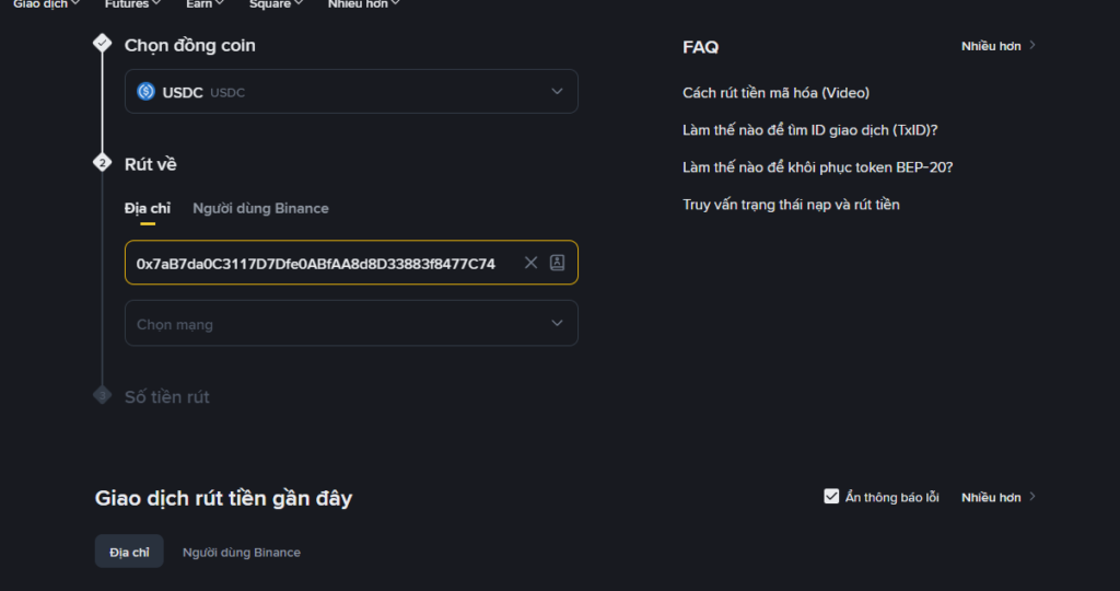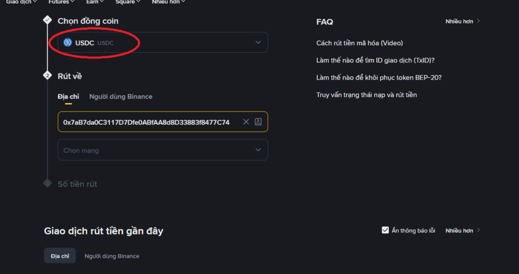 Rút tiền là thao tác có nguy cơ rủi ro cao hơn Deposit vì bạn phải tự nhập địa chỉ ví đích. Và khi tiền đã ra khỏi sàn rồi thì sàn sẽ không chịu trách nhiệm cho hành vi rút của bạn. Thao tác cũng tương tự trên mọi sàn giao dịch.