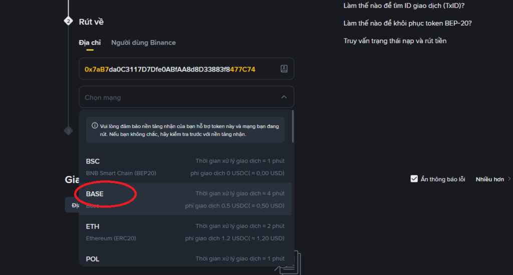 Bạn chọn mạng Base thì ví đích PHẢI hỗ trợ Base.