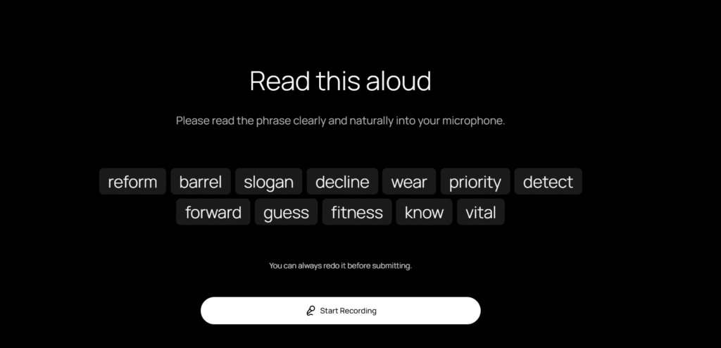 Hãy đọc lần lượt các từ/cụm từ xuất hiện trên màn hình. Xong mỗi lượt, bạn có thể Preview để nghe lại bản ghi, kiểm tra chất lượng rồi nhấn Submit. Hoàn tất bước này là tạo tài khoản thành công.