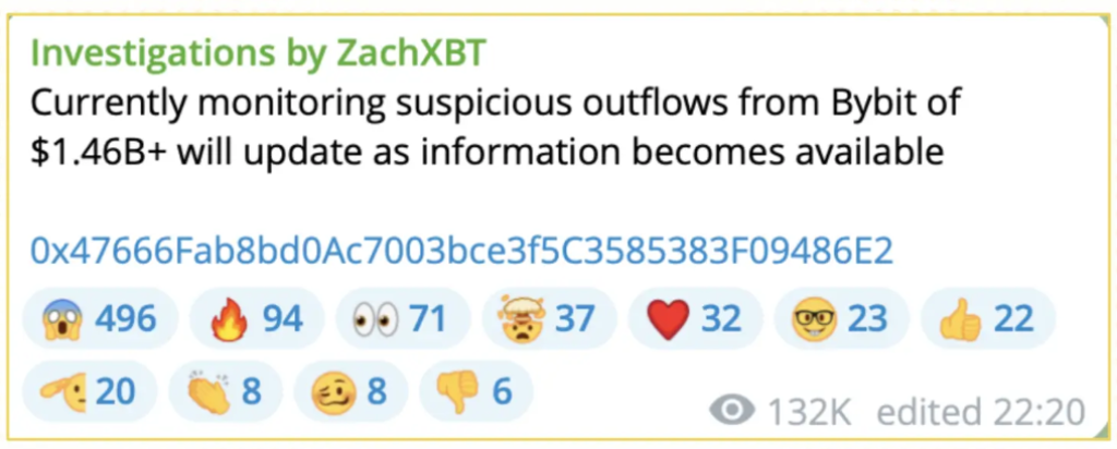 Mọi chuyện bắt đầu vào lúc 22:20 (giờ Việt Nam), khi ZachXBT đăng cảnh báo trên Telegram về các dấu hiệu bất thường tại Bybit. Ông cho biết một lượng lớn tài sản đang bị rút khỏi sàn một cách nhanh chóng Số tài sản này được chuyển đến địa chỉ 0x47666Fab8bd0Ac7003bce3f5C3585383F09486E2. Cụ thể, tổng cộng hơn 401.346 ETH, cùng 15.000 cmETH8.000 mETH và 90 USDT đã bị chuyển ra khỏi sàn giao dịch với tổng giá trị ước tính lên tới 1,46 tỷ USD.