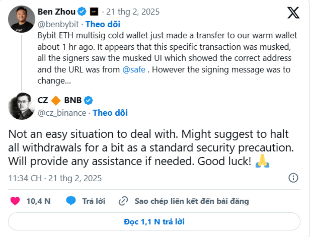 Khoảng 20 phút sau khi ZachXBT đưa ra cảnh báo, Ben Zhou – CEO của Bybit, đã thẳng thắn lên tiếng xác nhận sàn giao dịch đã bị tấn công. Ông cho biết kẻ tấn công đã giả mạo giao diện phần mềm nhằm đánh lừa đội ngũ ký giao dịch, từ đó thay đổi logic hợp đồng thông minh của ví lạnh, nhưng nhấn mạnh rằng các ví nóng, warm wallet và các ví lạnh khác vẫn an toàn.