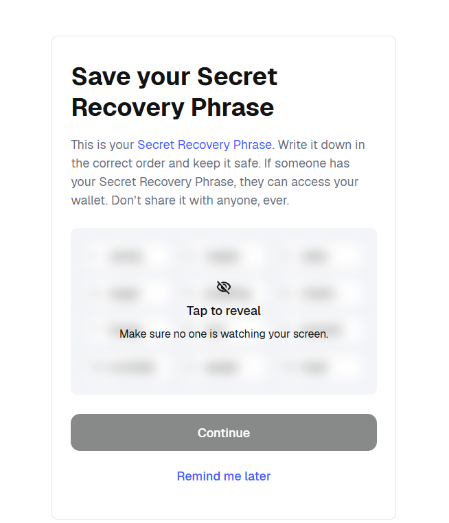 Secret Backup Phrase là thông tin quan trọng nhất của ví. Nếu bị mất hoặc để người khác có được, bạn sẽ mất hoàn toàn quyền kiểm soát ví và toàn bộ tài sản.