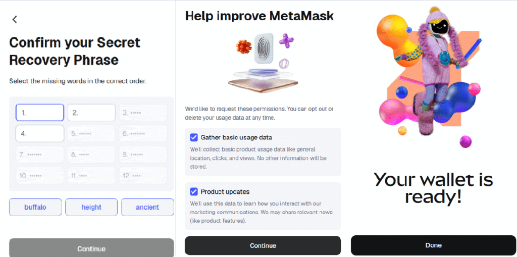 Tiếp theo, bạn điền lần lượt 3 từ ở dưới đúng theo vị trí của nó để xác nhận Seed Phrase và chọn “Continute” —> Tick vào ô vuông ” Product updates” hoặc để trống —> Bấm “Done” (Theo minh hoạ các hình phía dưới)