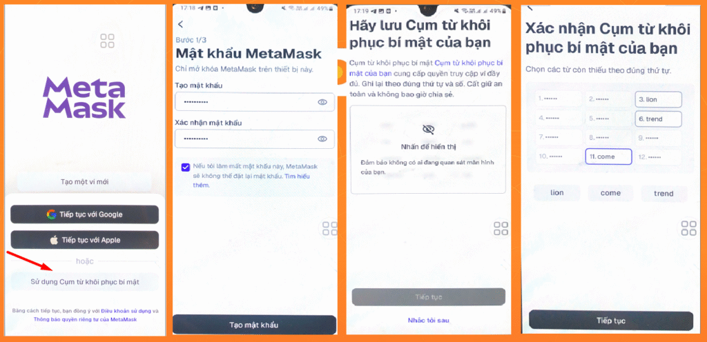 Lúc này màn hình sẽ hiển thị cụm từ khôi phục bí mật nhưng được làm mờ. Bạn click vào biểu tượng con mắt để hiển thị cụm khôi phục. Hãy đảm bảo rằng bạn lưu lại 12 từ Seed Phrase một cách chính xác và an toàn. Sau đó bạn bấm “Tiếp tục“.