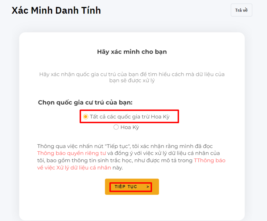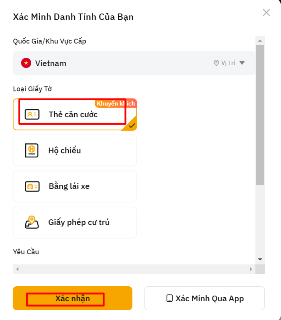 Bước 2: Chọn quốc gia Việt Nam và loại giấy tờ tuỳ thân bạn muốn sử dụng để KYC. Sau đó, nhấn “Xác nhận“.
