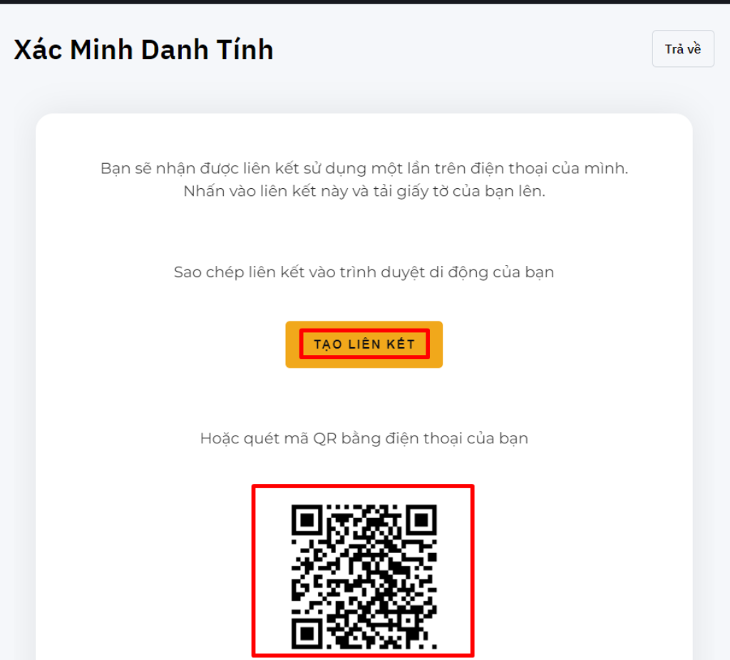 Bước 4: Dùng điện thoại quyét mã QR hoặc tạo liên kết và dán link vào trình duyệt duyệt điện thoại để tiếp tục quá trình xác minh.