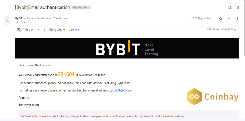 Bước 4: Bybit sẽ gửi mã xác minh gồm 6 chữ số qua Email hoặc Số điện thoại của bạn.