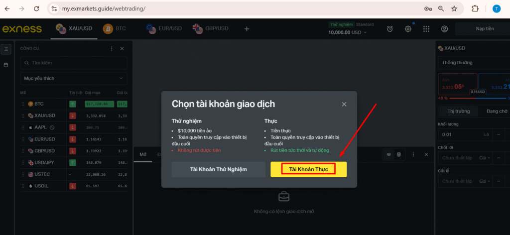 Ngay sau đó, bạn sẽ được chuyển tới giao diện webtrading. Tại đây, hãy nhấn vào mục “Tài khoản thực” để tiếp tục quá trình mở tài khoản.