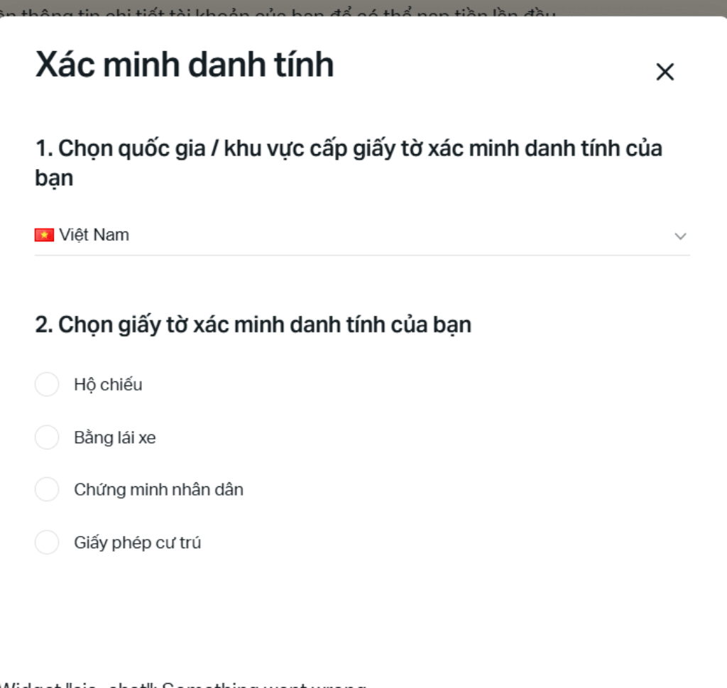Chọn loại giấy tờ xác minh: CMND, CCCD, Hộ chiếu, Bằng lái xe, Giấy phép cư trú.