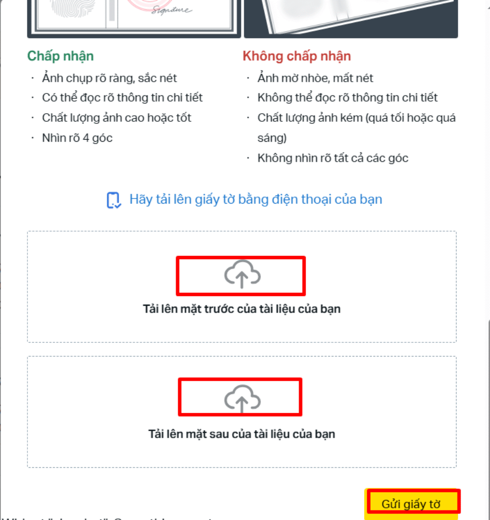 Tải lên mặt trước và sau của giấy tờ, rồi bấm “Gửi giấy tờ”.