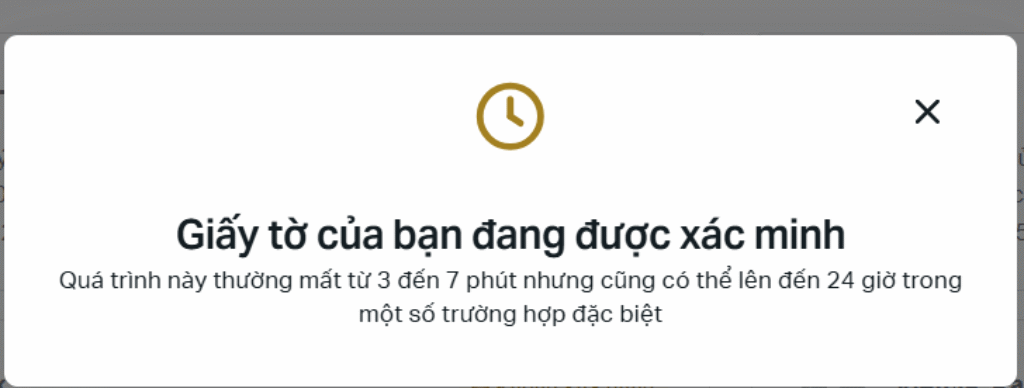 Sau khi tải lên mặt trước, mặt sau giấy tờ, bạn sẽ nhận được giao diện thông báo như bên dưới. Hệ thống sẽ xác minh tài khoản của bạn 3 đến 7 phút hoặc lâu hơn .