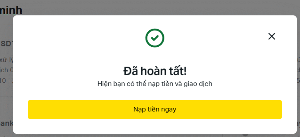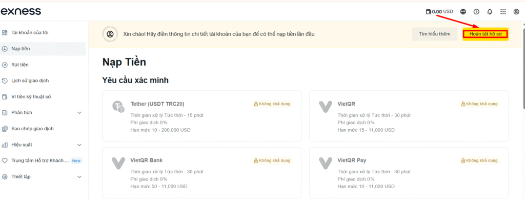 Vì tài khoản chưa được xác minh, bạn sẽ chưa thể nạp tiền hay giao dịch. Hãy chuyển sang bước tiếp theo để hoàn tất hồ sơ.