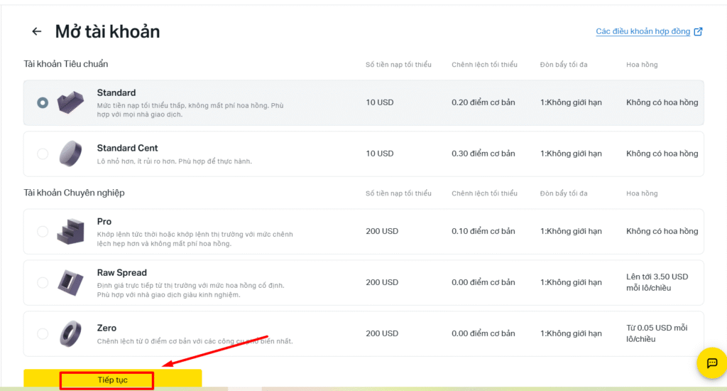 Chọn loại tài khoản phù hợp với nhu cầu giao dịch của mình rồi bấm tiếp tục