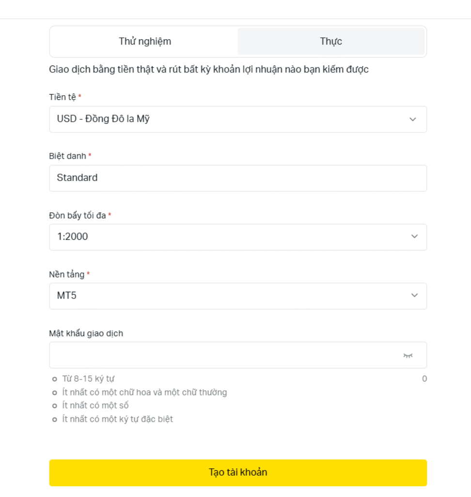– Chọn loại tài khoản: Thử nghiệm hoặc Thực.