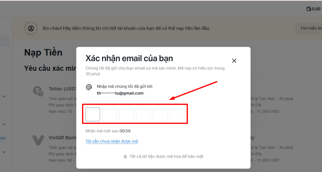 + Xác minh Email: kiểm tra hộp thư, nhập mã xác nhận. Nếu bạn không tìm thấy mã xác nhận ở thư chính hãy tìm nó ở các mục thư khác.