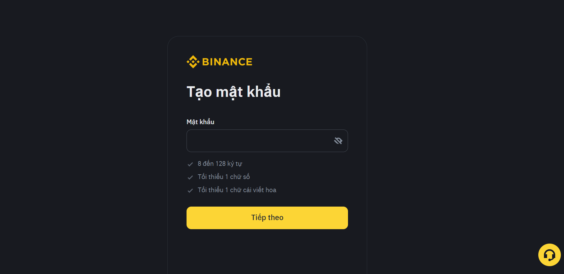 Bước 4: Đăt mật khẩu cho tài khoản Binance của bạn và bấm Tiếp theo. Lưu ý khi đặt mật khẩu: tối thiểu 8 kí tự, 1 số và 1 chữ cái viết hoa. Ví dụ: Thanh1996. Đến đây bạn đã đăng kí thành công tài khoản Binance.