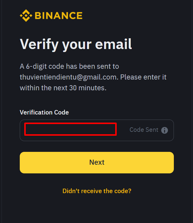 Bước 3: Sau khi làm Bước 1, Binance sẽ gửi mã xác minh vào email/số điện thoại bạn nhập trước đó. Lúc này bạn vào hộp thư đến của Email hoặc phần tin nhắn của điện thoại để lấy mã nhập vào và bấm Next. Đối với những bạn dùng Email mà không tìm thấy thư gửi đến, bạn nên kiểm trên thêm mục thư rác.